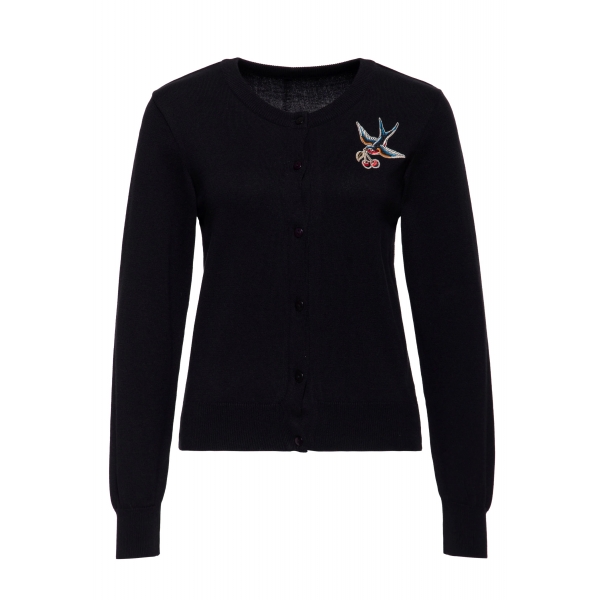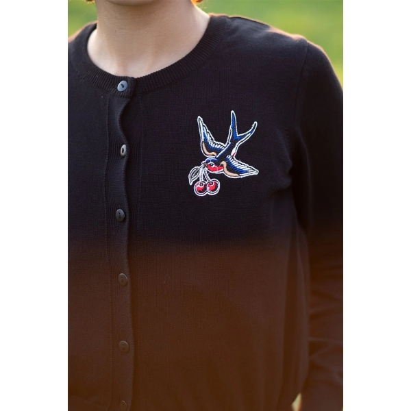 Craquez pour le cardigan Queen Kerosin Swallow & Cherry noir au style rockabilly 50’s. Avec sa broderie hirondelle et cerises et sa coupe féminine, il apporte une touche rockailly unique à toutes vos tenues.