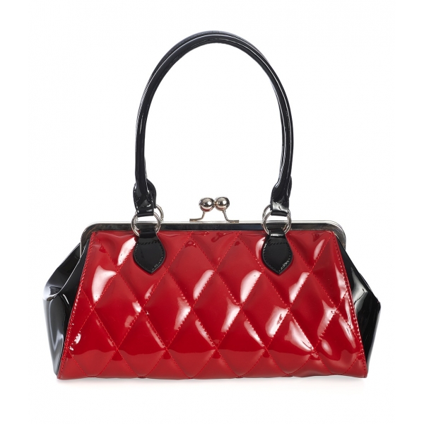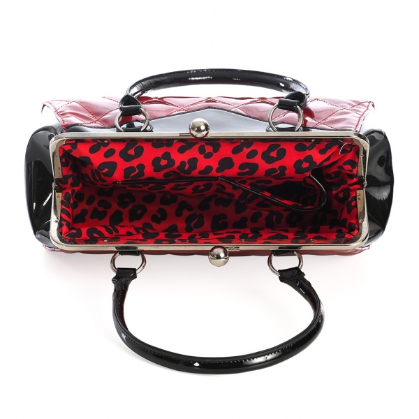 Sac à main pin-up rétro Banned Apparel au style rockabilly. Rouge vernis matelassé, détails noirs brillants, fermeture clip vintage et doublure léopard. L’accessoire parfait pour un look rétro chic.