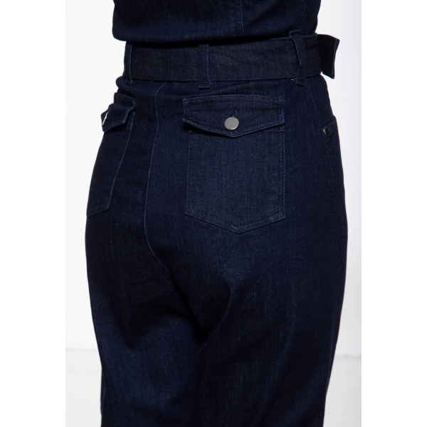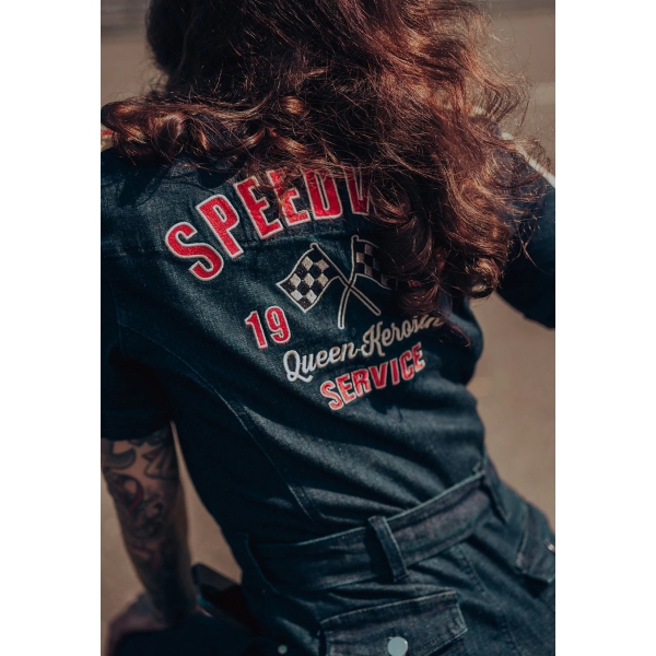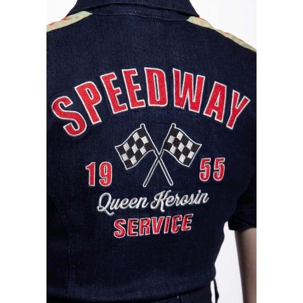 Adoptez un look racing vintage avec cette combinaison Queen Kerosin en denim stretch. Coupe cintrée, broderie "Speedway Service" et détails workwear pour un style affirmé et féminin.